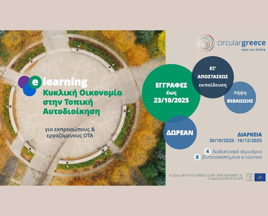 A comprehensive distance-learning program on “Circular Economy in Local Government” is being implemented within the framework of the LIFE-IP CEI-Greece project “Circular Economy Implementation in Greece.” The training program is addressed to representatives and employees of Local Authorities (Municipalities & Regions) who are interested in strengthening their knowledge on waste management, decision-making, and the implementation of Circular Economy actions within local communities. The program is offered FREE OF CHARGE and is delivered exclusively online, through both synchronous (webinars) and asynchronous (pre-recorded e-courses) learning. Participants will receive a Certificate of Attendance.
