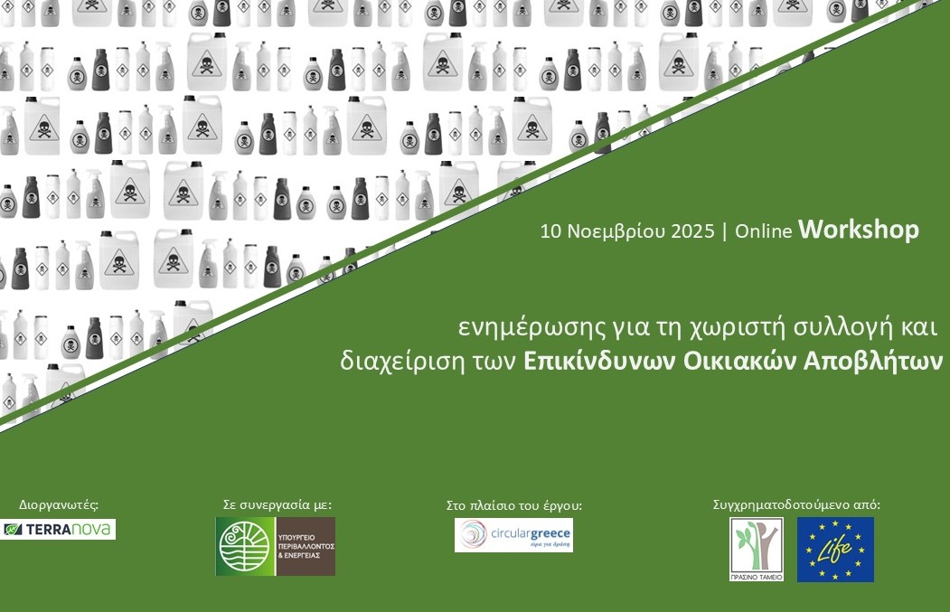Terra Nova, in collaboration with the Ministry of Environment and Energy (YPEN), is organizing an interactive online workshop on 10 November focusing on the separate collection and management of Hazardous Household Waste (HHW), within the framework of the European project LIFE-IP CEI-Greece on circular economy.